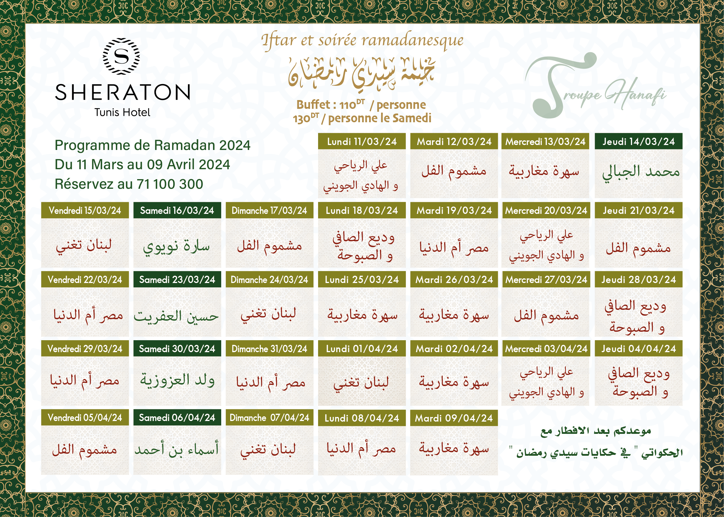 Rejoignez-nous au Sheraton Tunis Hotel pour célébrer le Ramadan d’une manière mémorable. Avec une combinaison unique de divertissements culturels, de délices culinaires et d’une atmosphère chaleureuse, l’événement Khimet Sidi Ramdhan promet d’être une expérience inoubliable pour tous.